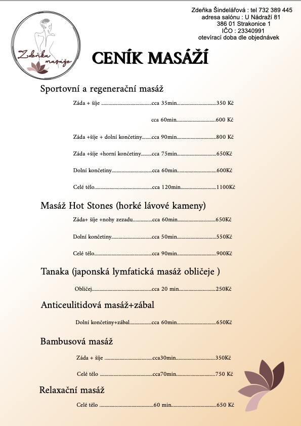K 1. 8. 2025 vítáme naši další nájemkyni - Zdeňku Šindelářovou nabízející široké spektrum masáží. Více o nabídce služeb včetně cen níže.